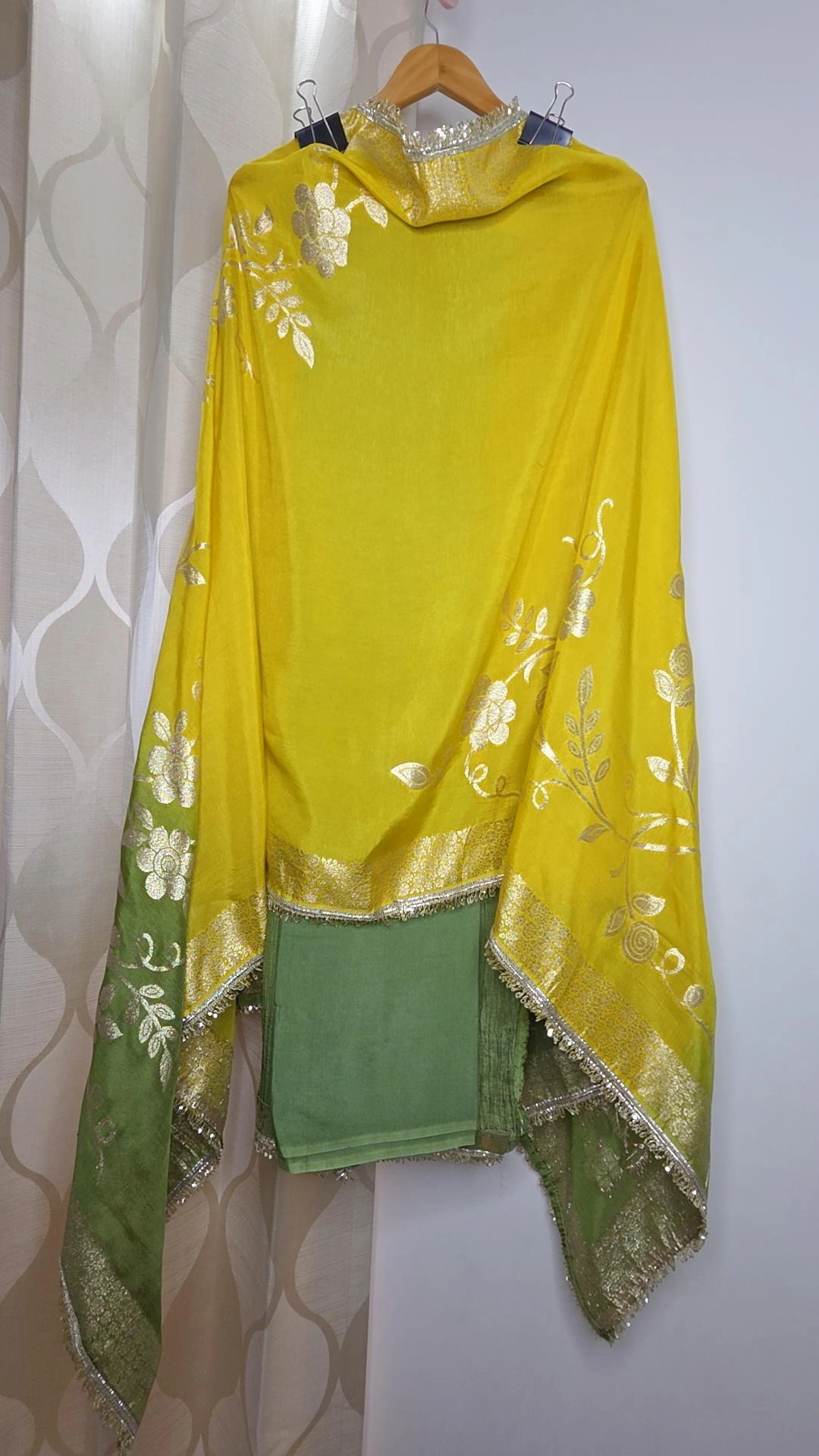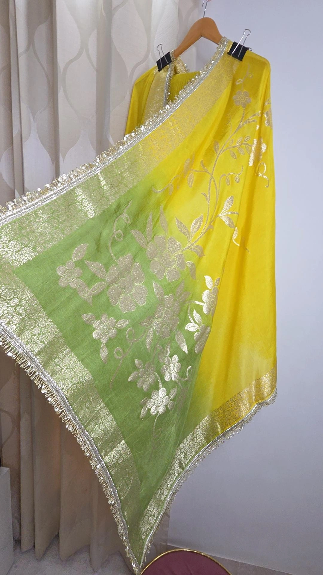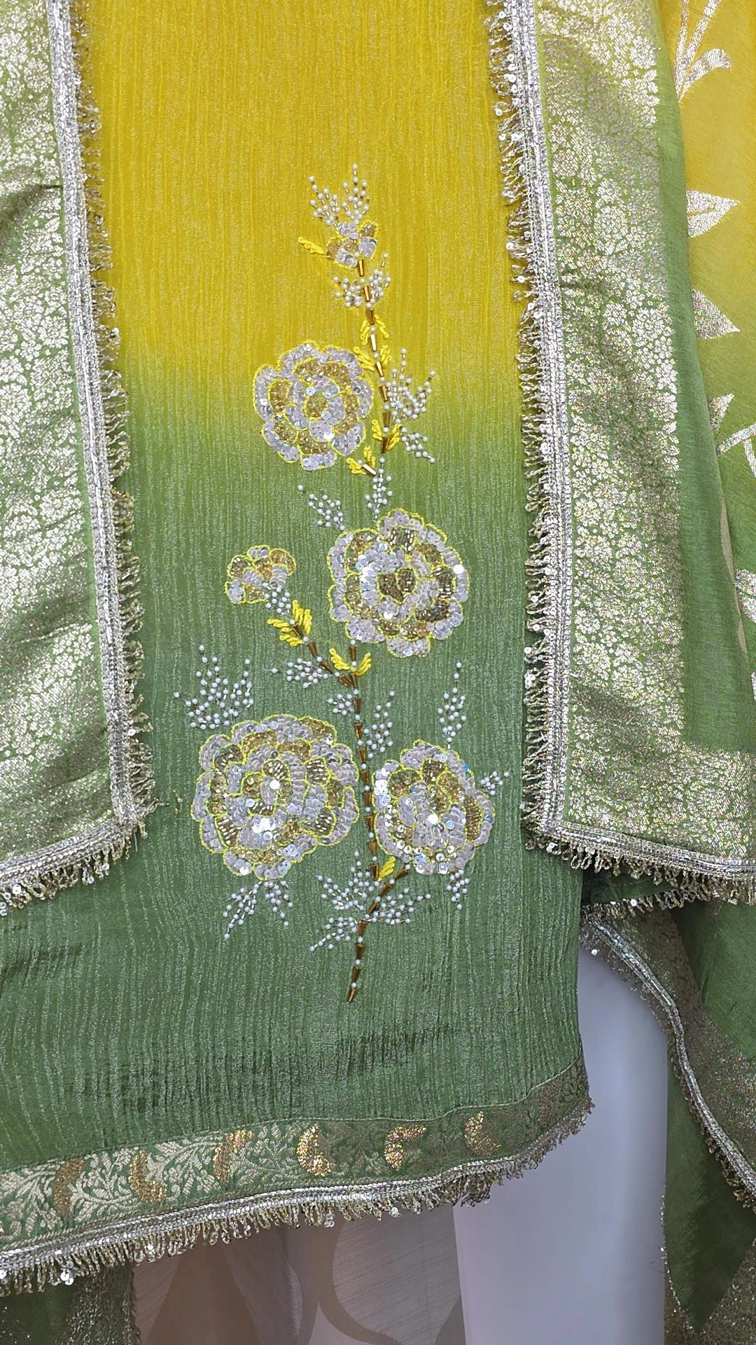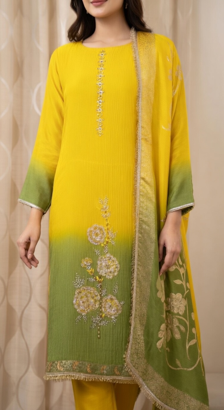 The kurta showcases a smooth gradient transition from bright sunshine yellow at the top to a soft olive green towards the hem, creating a visually striking and modern appeal. Designed with subtle vertical textures, the kurta is adorned with delicate floral embroidery along the front panel and near the lower portion, adding a hint of sophistication and charm. The round neckline is enhanced with minimal embellishment, giving it a graceful and refined look. The three-quarter sleeves continue the gradient theme, perfectly balancing elegance and comfort.