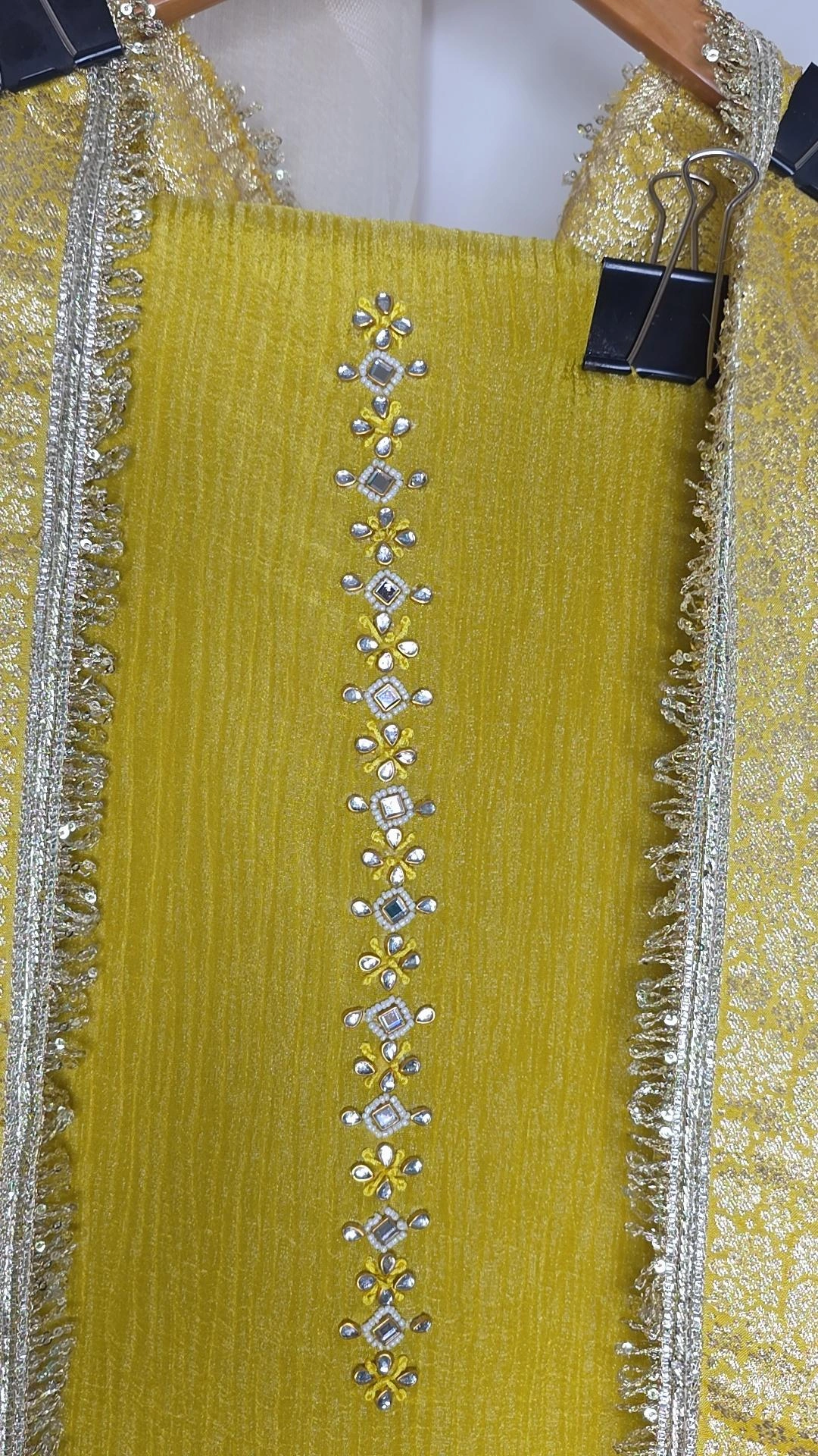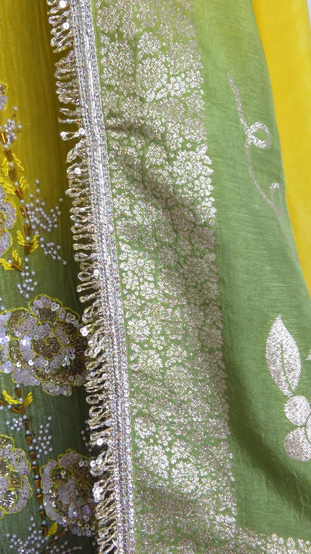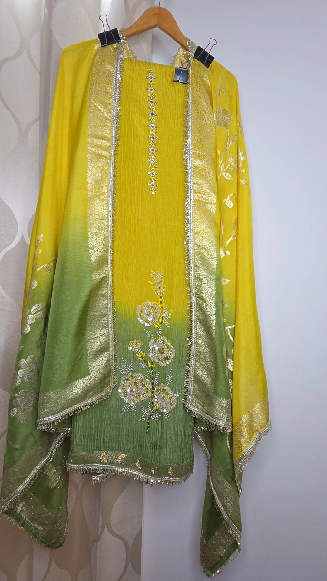 The kurta showcases a smooth gradient transition from bright sunshine yellow at the top to a soft olive green towards the hem, creating a visually striking and modern appeal. Designed with subtle vertical textures, the kurta is adorned with delicate floral embroidery along the front panel and near the lower portion, adding a hint of sophistication and charm. The round neckline is enhanced with minimal embellishment, giving it a graceful and refined look. The three-quarter sleeves continue the gradient theme, perfectly balancing elegance and comfort.