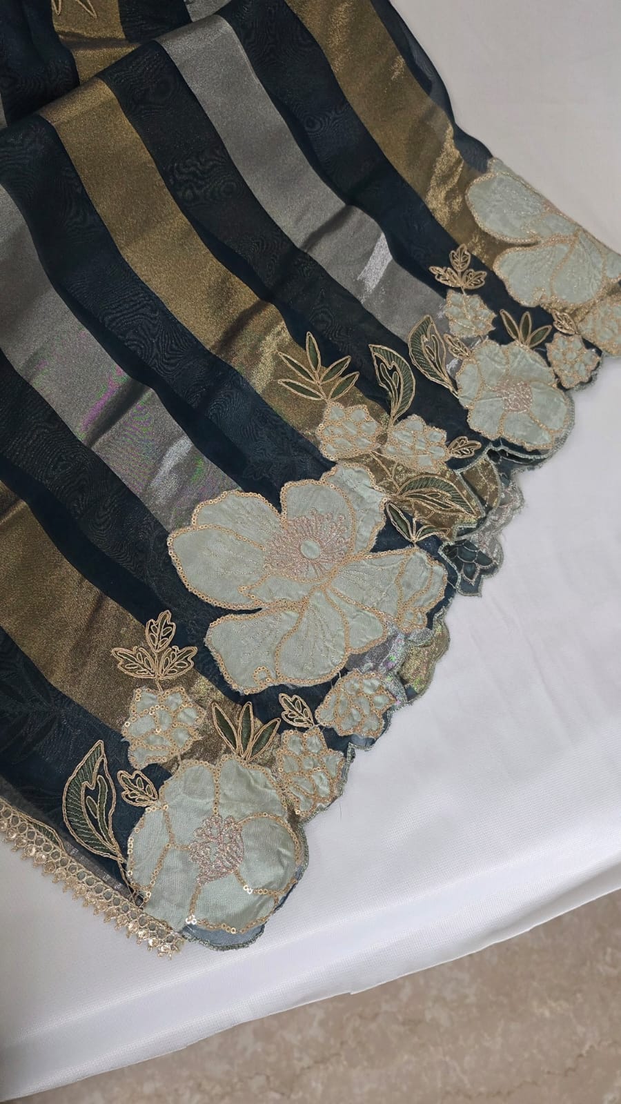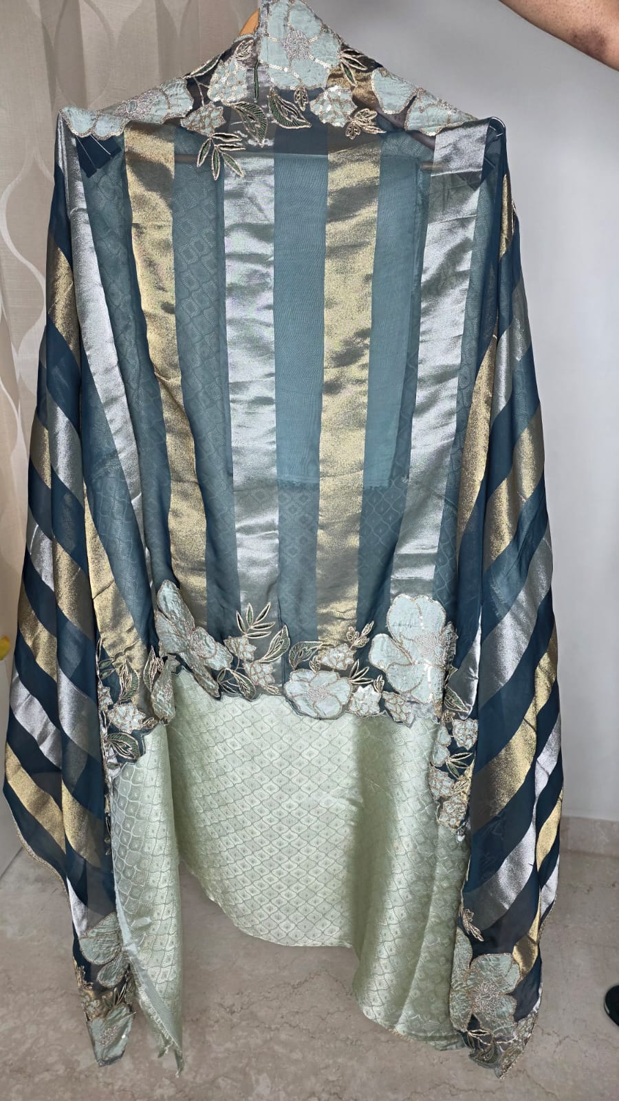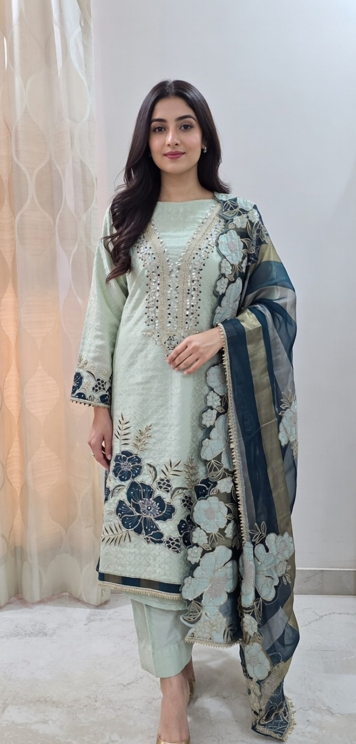 The heavy thread and lace embroidery on the front, sleeves, and hemline gives the outfit a premium and elegant look, while maintaining its traditional charm with a modern touch. The soft pastel shades, which are trending for festive and summer occasions, further enhance its appeal, and the scalloped lace finishing on the sleeves and hem adds a refined, luxurious feel.