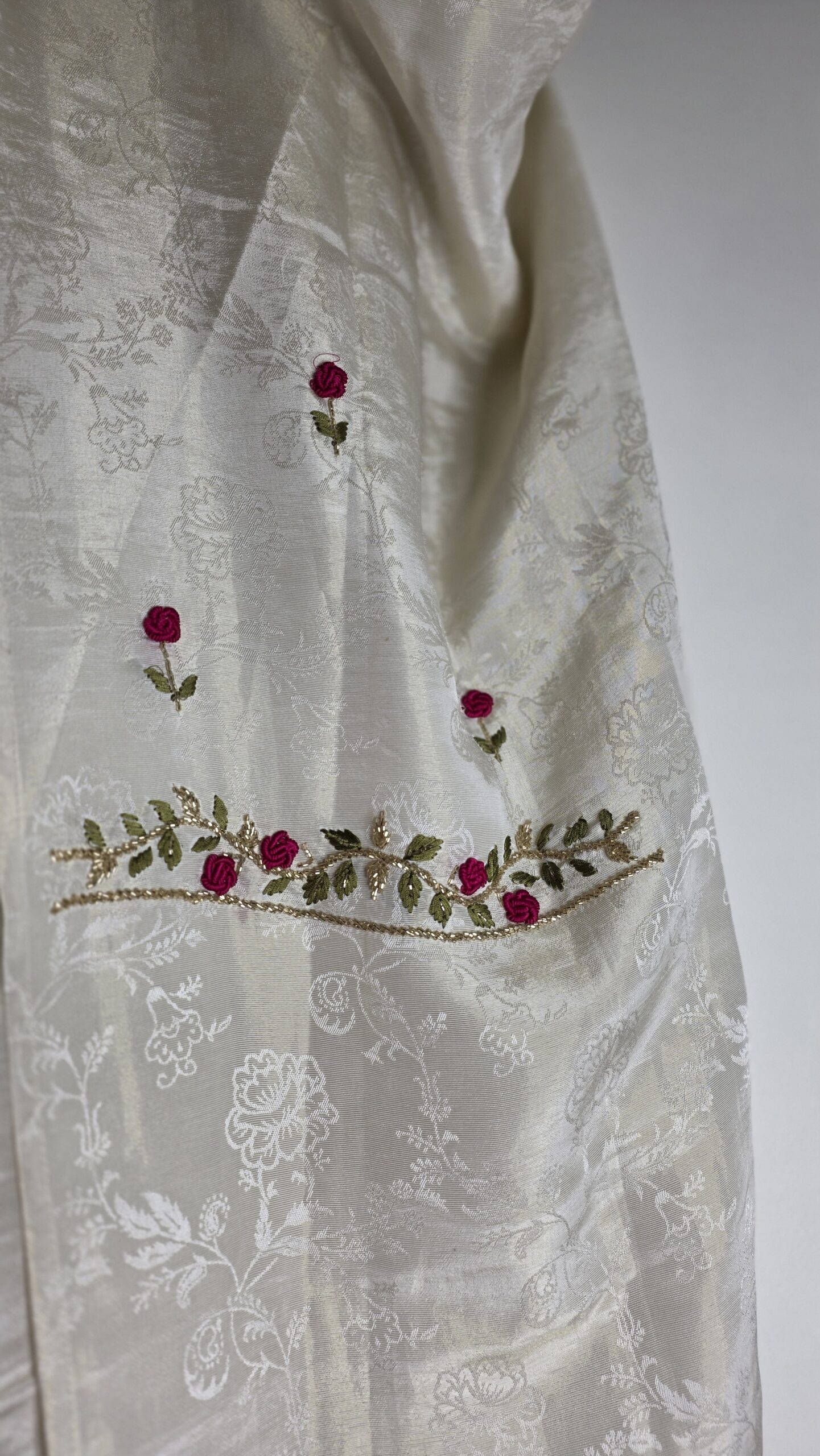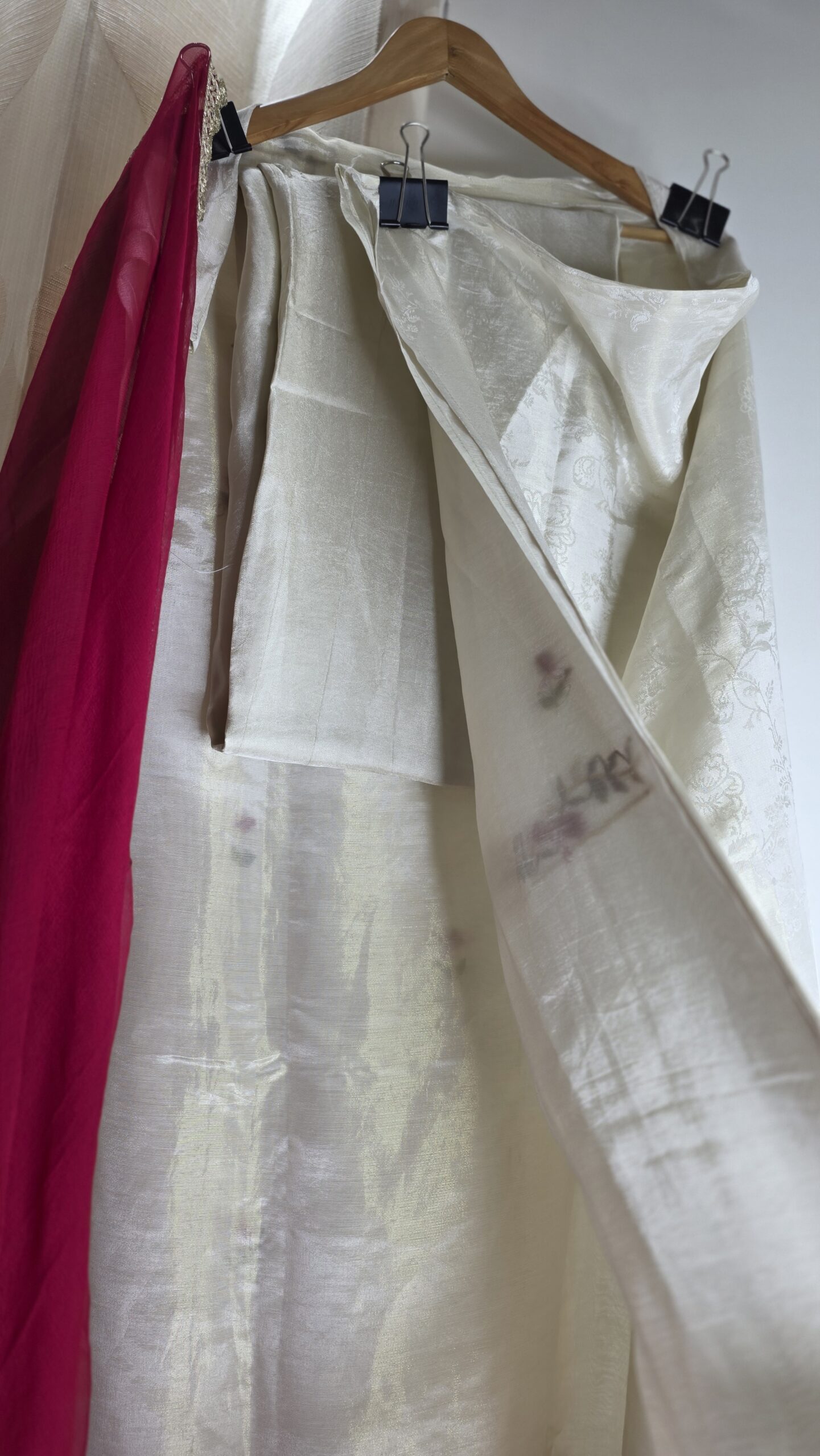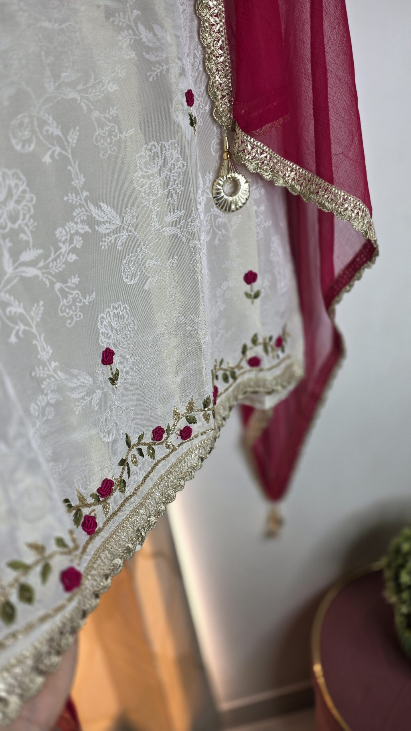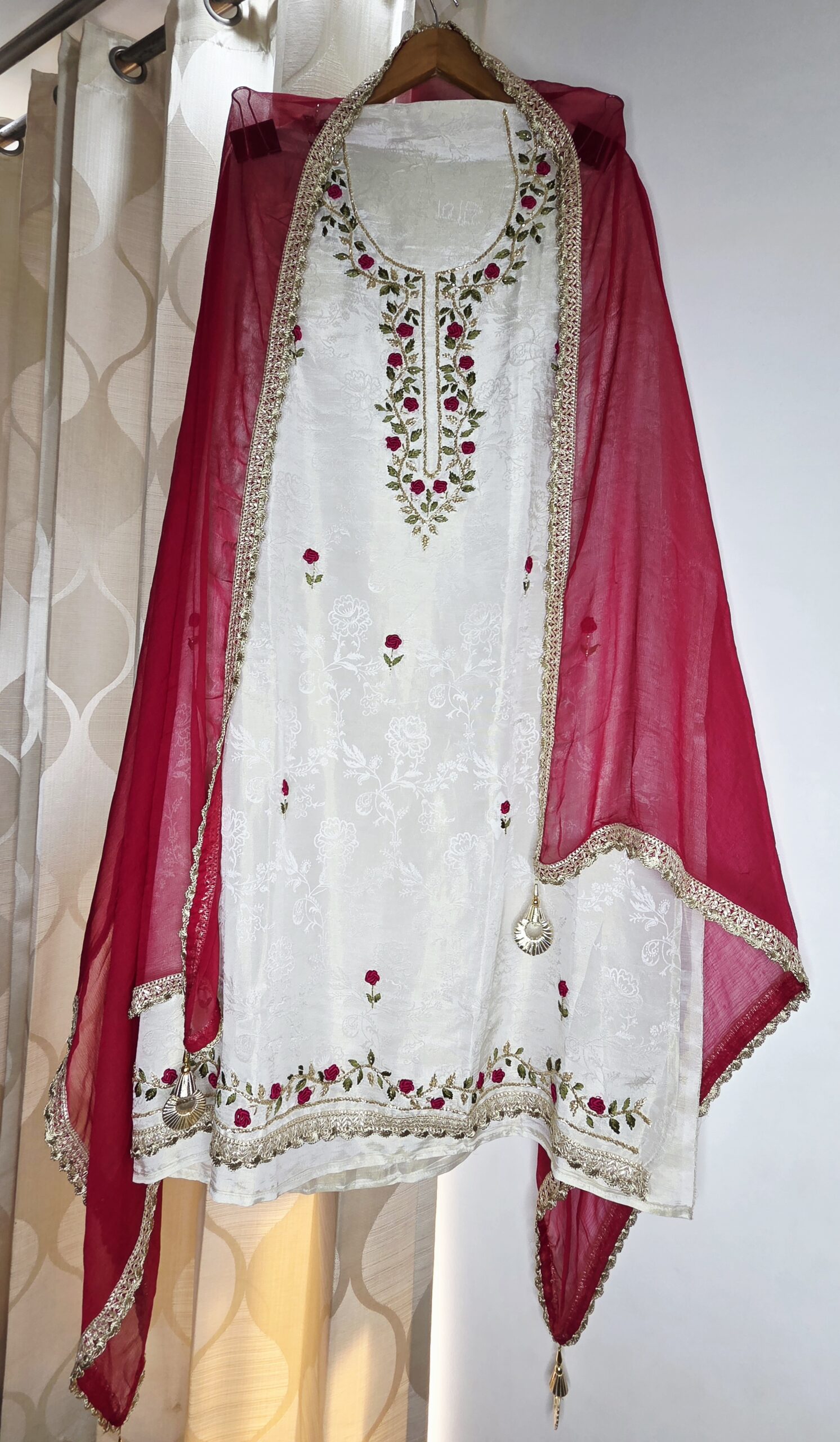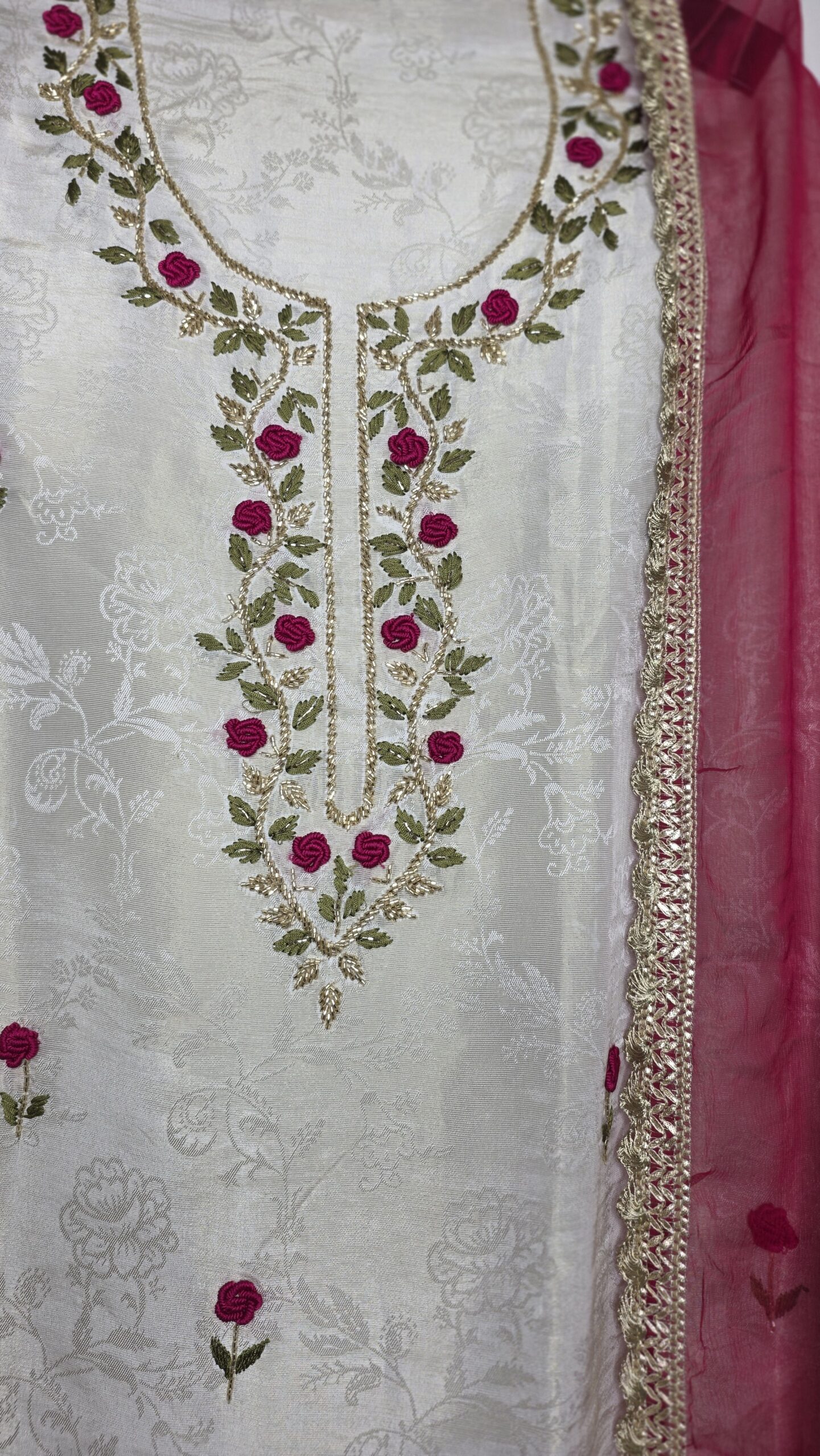 A timeless ivory suit set adorned with delicate floral embroidery, paired with a vibrant pink organza dupatta for a striking contrast. Finished with elegant lace details and subtle embellishments, it blends simplicity with festive charm. Perfect for celebrations and special occasions.