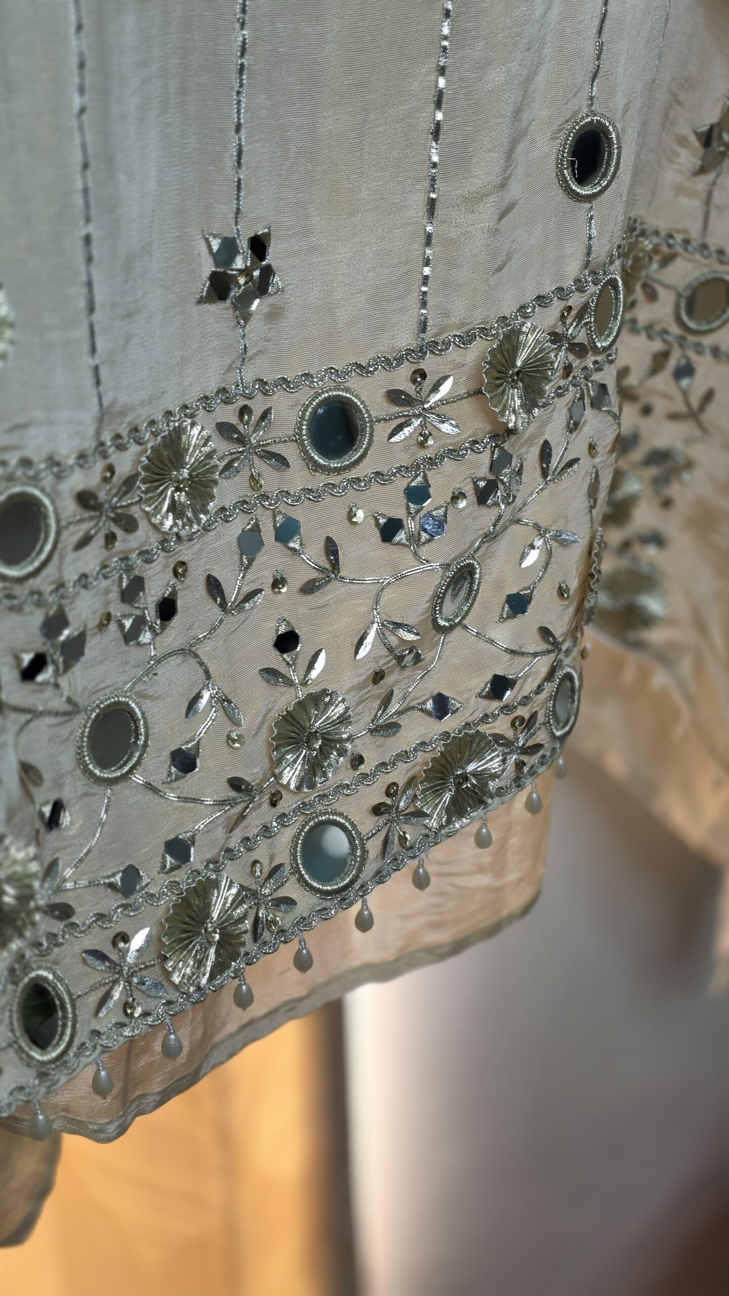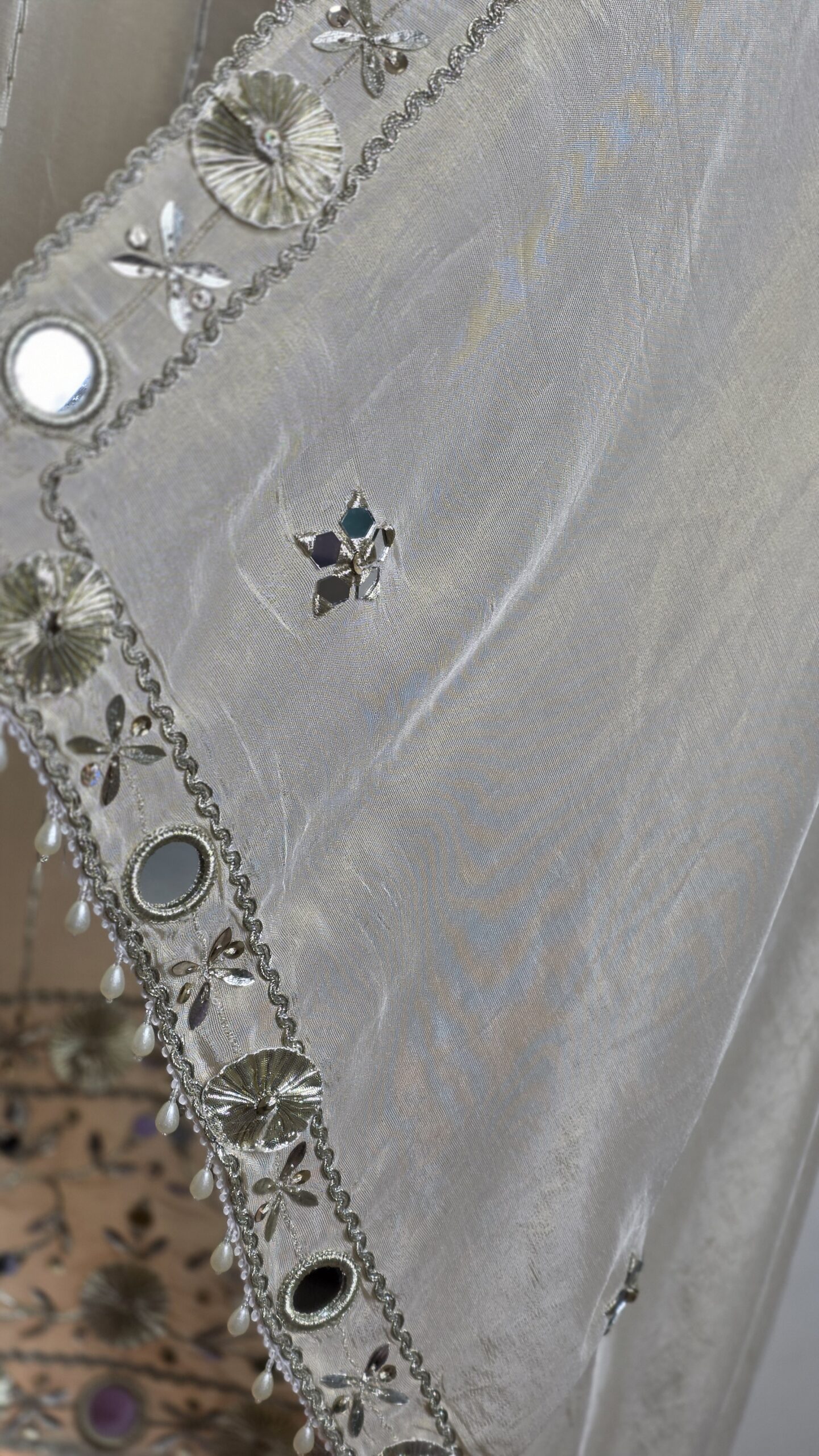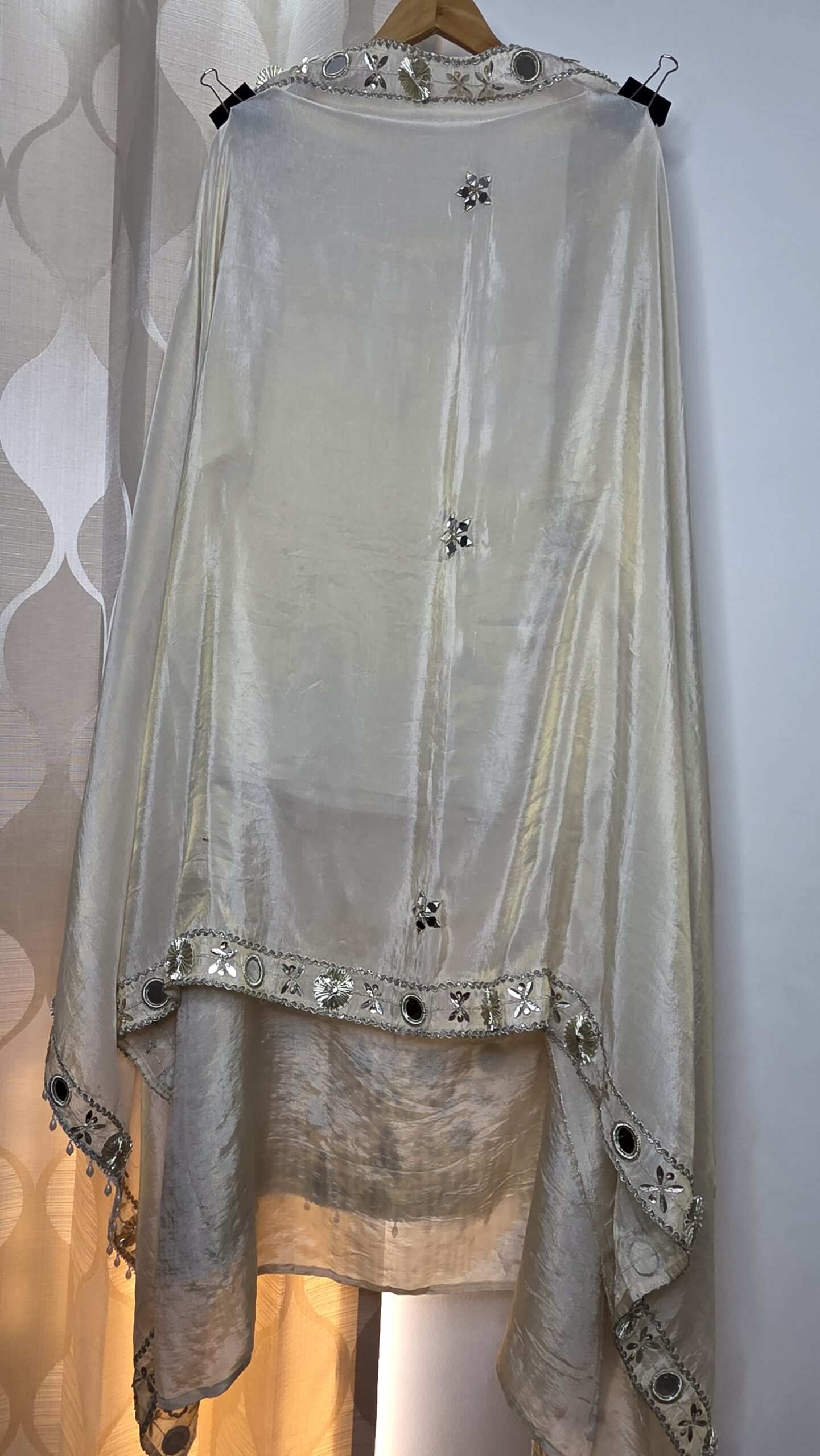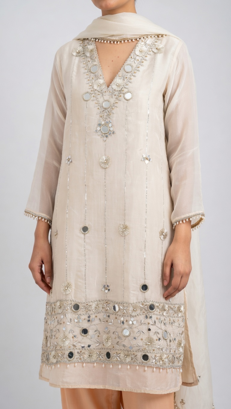 This elegant ivory sheer kurta features intricate mirror (shisha) work, silver gota patti, sequins, and delicate pearl accents. The V-neckline and borders are heavily embellished with reflective mirrors and metallic embroidery, giving it a festive sparkle. Paired with a matching sheer dupatta with gota and mirror detailing. Perfect for weddings, Eid, and special occasions. Lightweight, breathable fabric with beautiful drape and movement.