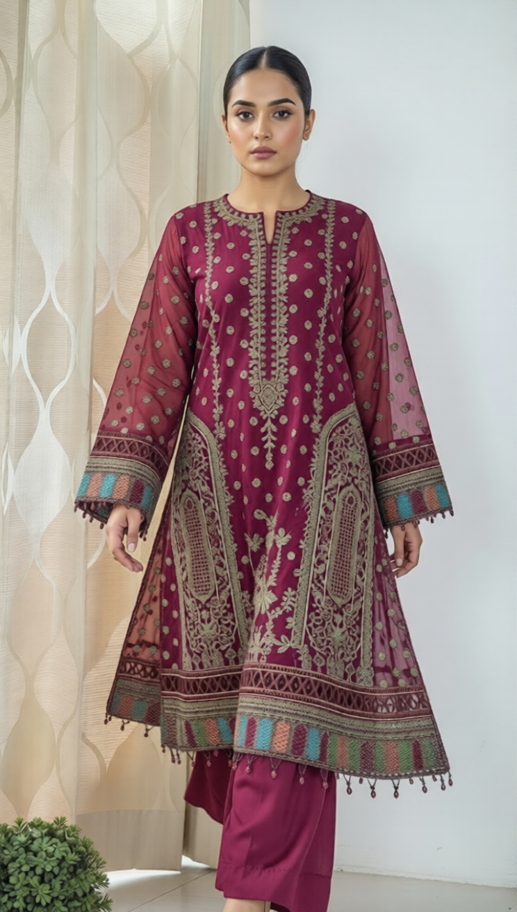 This elegant Anarkali gown features a sheer net or georgette overlay on a satin base, creating a lightweight, flowing silhouette with a graceful umbrella flare. The round neckline and dense gold zari and resham embroidery add richness, with intricate floral and lattice patterns throughout. Full-length bell sleeves with colorful ethnic trims and tassels enhance its charm, while the ornate multi-layered hem and matching maroon bottoms complete the festive, traditional look.