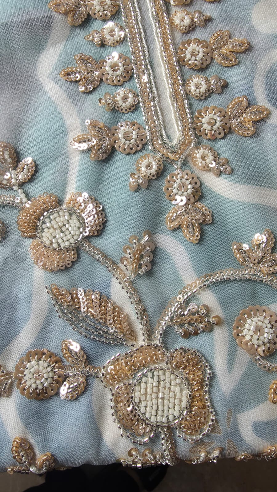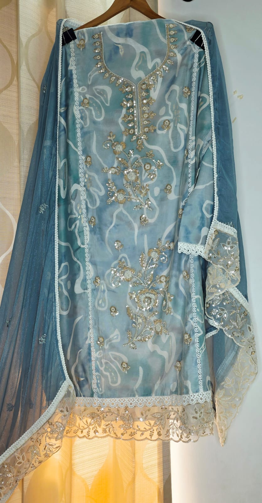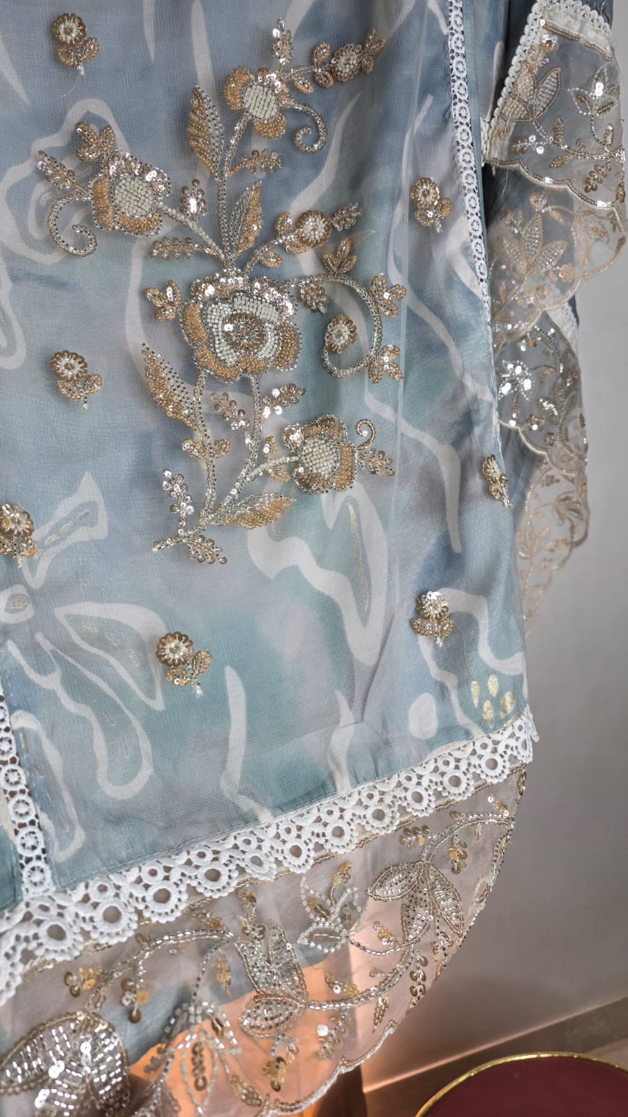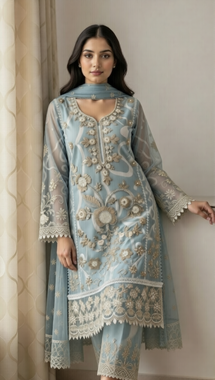 The overall vibe is effortlessly sophisticated and feminine, celebrating rich Pakistani embroidery craftsmanship with a modern, sheer elegance. The luminous gold detailing against the serene blue base creates a soft yet opulent glow that catches the light beautifully. Perfect for daytime festivities or evening celebrations, it exudes grace, luxury, and timeless charm with every movement.