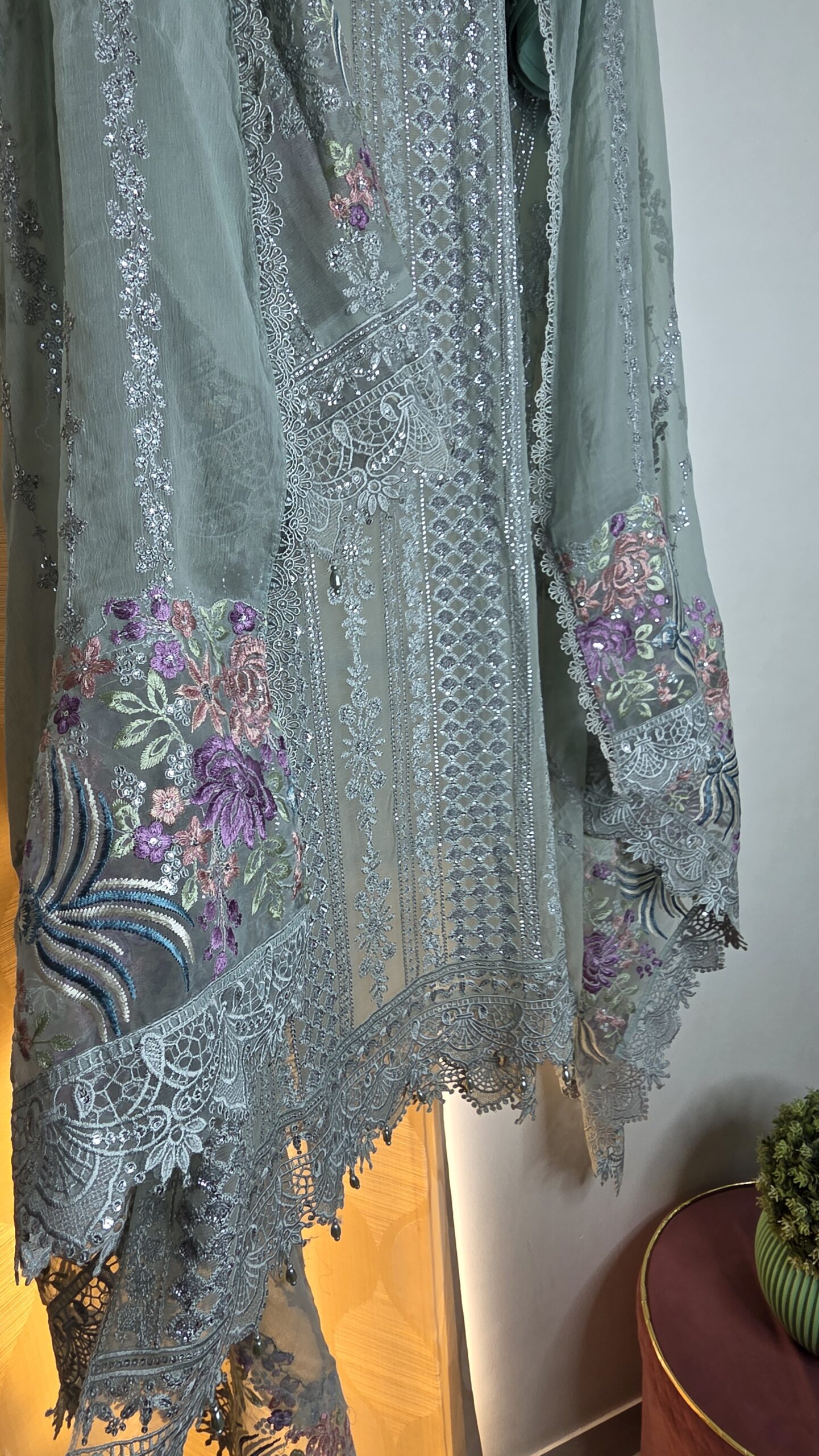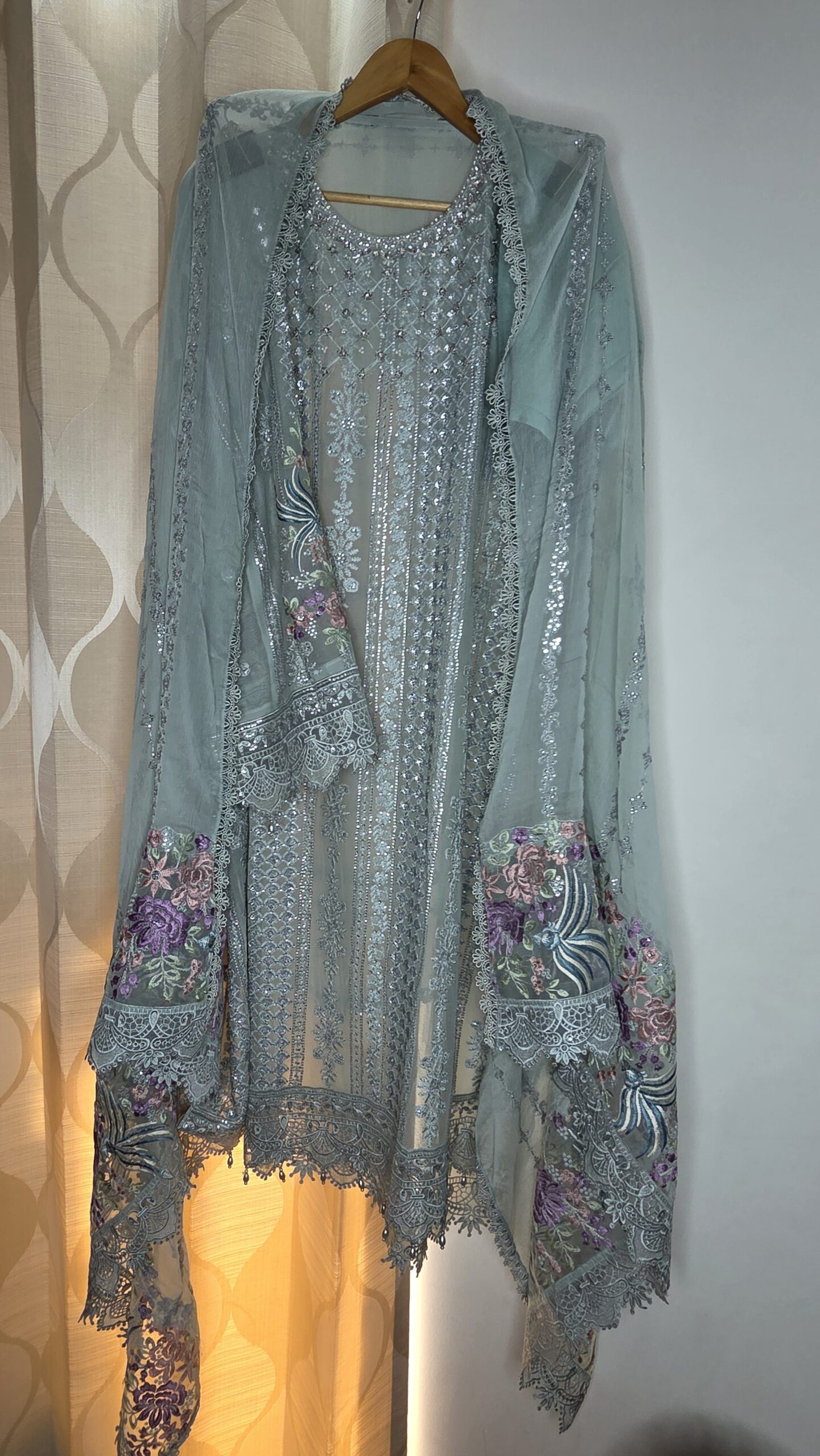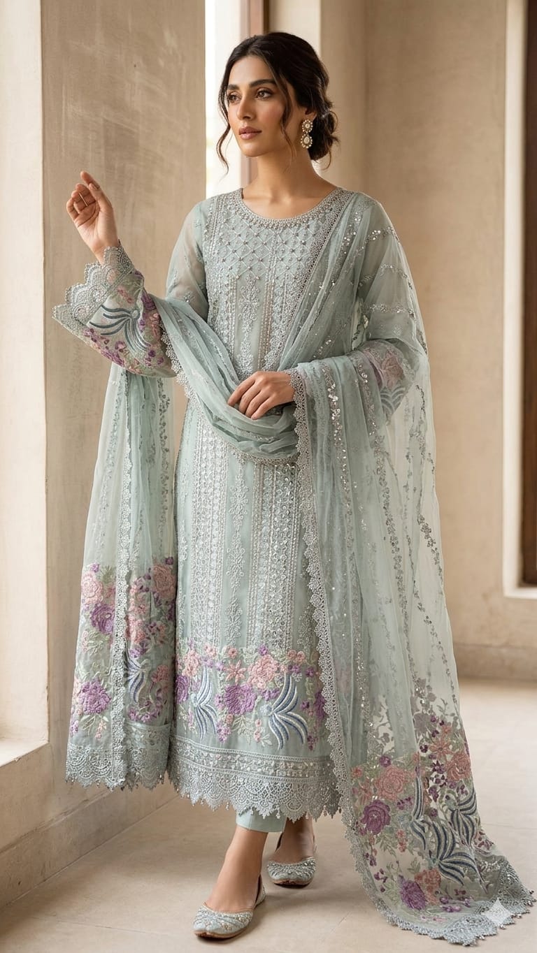A graceful mint green designer suit set crafted in sheer organza, adorned with intricate floral embroidery and delicate sequin detailing. Paired with a flowy dupatta featuring elegant borders, it exudes timeless charm and sophistication. Perfect for festive occasions and daytime celebrations.